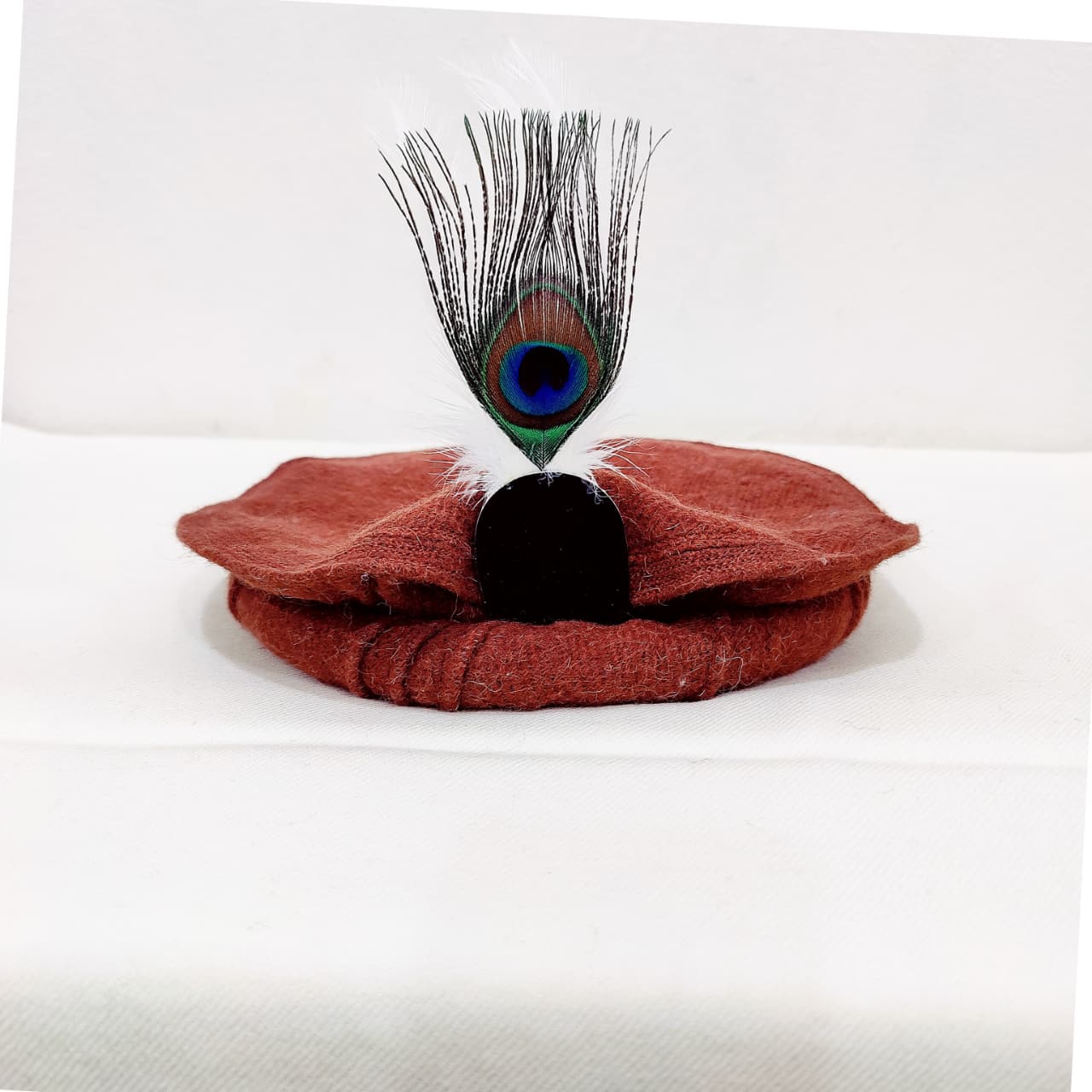 Elegant Rust Chitrali Woolen Pakool with Peacock Feather
